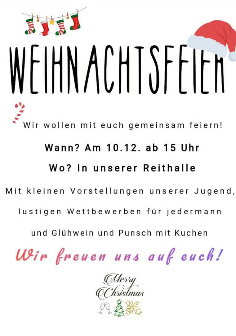 Am 14. Dezember ab 14:00 Uhr findet unsere diesjährige Weihnachtsfeier mit zahlreichen Vorführungen unserer Mitglieder und vielen Weihnachtsleckereien für Mensch und Pferd statt. Selbstverständlich kommt auch wieder der Nikolaus bei uns vorbei.